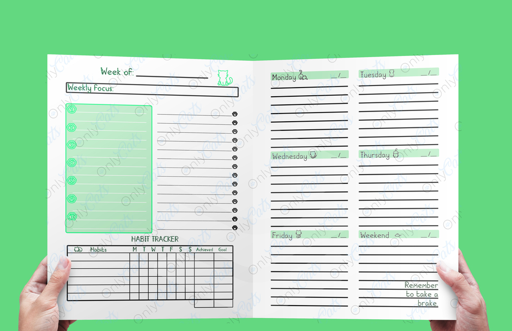 Green Daily-Weekly Planner for Cats Lovers Organization π» Simple Planner / Kawaii Cat simple planner / Minimalist Gift for cat lovers